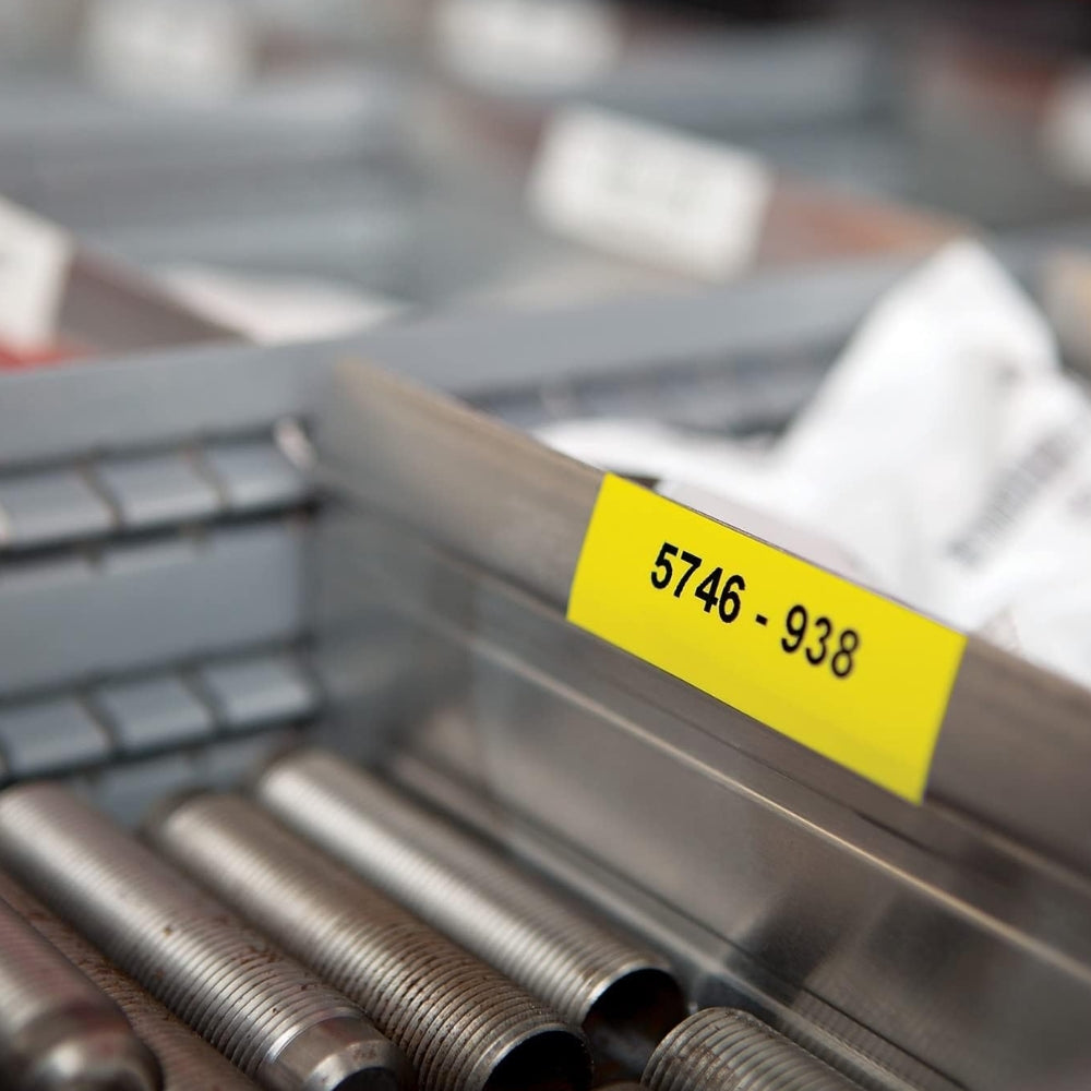 • La cinta de vinil Dymo Rhino de 19 mm, en color negro sobre amarillo, es perfecta para señalización en áreas peligrosas o de advertencia, asegurando alta visibilidad en entornos industriales.